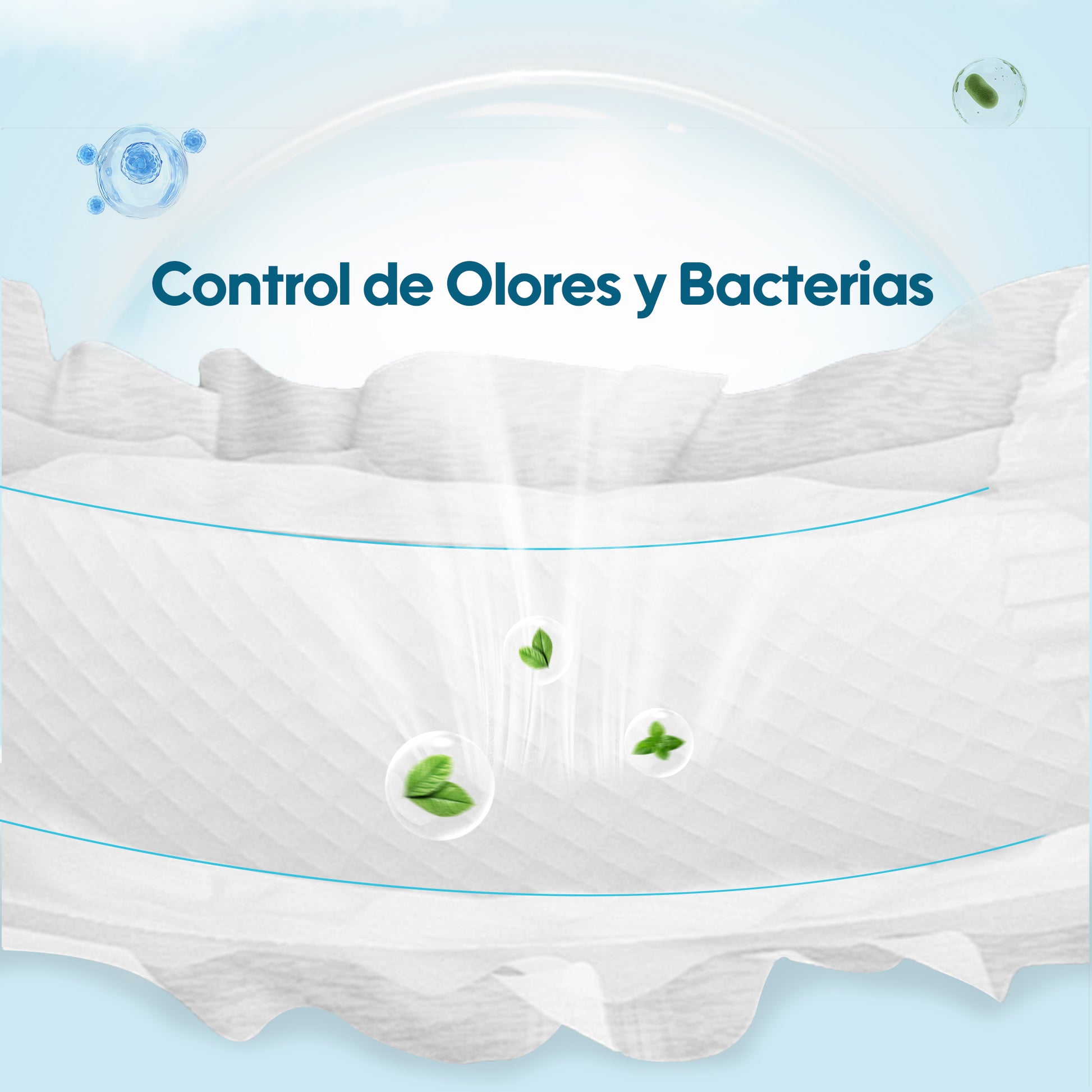 Para prevenir cualquier fuga, hemos incorporado barreras en las piernas, dándole la confianza para continuar su día sin preocupaciones. La capa ADL ayuda a que la orina se difunda rápidamente, mejorando la eficiencia de absorción y manteniéndolo/a seco/a y fresco/a. También incluimos un indicador de humedad que le recordará cambiar el producto a tiempo, asegurando higiene y conveniencia.
