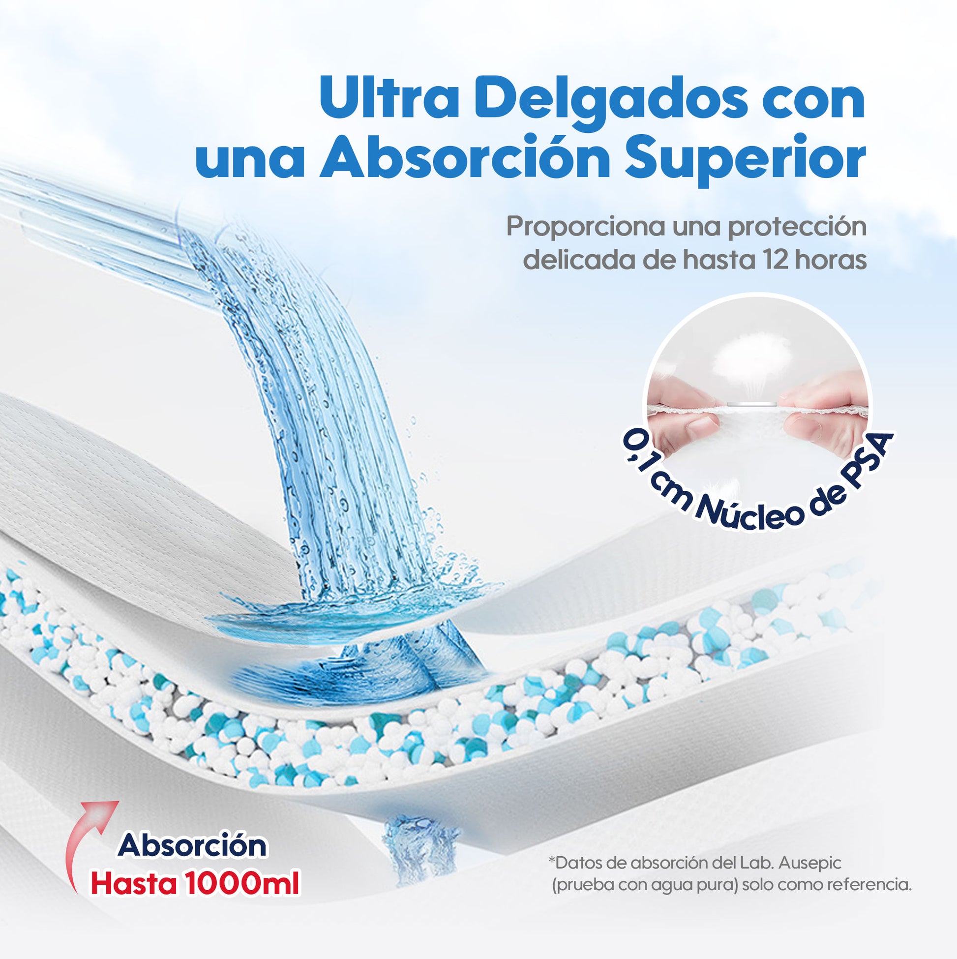 Experimenta lo último en comodidad y protección con nuestros pañales y calzoncillos ultrafinos. Con un núcleo absorbente Ultra-Thin Core™ de 2 mm, estos productos están diseñados para ser transpirables y ligeros, evitando la formación de grumos y garantizando un rendimiento constante. La innovadora Película MicroAiry™ permite un flujo de aire óptimo, manteniendo la piel de tu bebé fresca y seca. Con Comfort Fit Waistband™ y la lámina superior 3D Pearl Pattern que mejora la transpirabilidad en un 30%, tu pequeño disfrutará de comodidad durante todo el día. Equipados con doble protección antifugas, una capa de secado rápido y un práctico indicador de humedad, estos pañales proporcionan una protección fiable al tiempo que son suaves con la piel sensible.